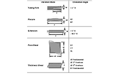 經(jīng)由不同的石英切割角度及不同電極型狀的電場(chǎng)效應(yīng), 石英芯片展現(xiàn)了各種不同的振動(dòng)模態(tài). 以經(jīng)常產(chǎn)生的振動(dòng)模態(tài)可以概分為擾曲模態(tài)(flexture mode), 伸縮模態(tài)(extension mode), 面剪切模態(tài)(face shear mode) 和 厚度剪切模態(tài)(thickness shear mode). 這幾種振動(dòng)模態(tài)以簡(jiǎn)單的方法在表一中可以看到.