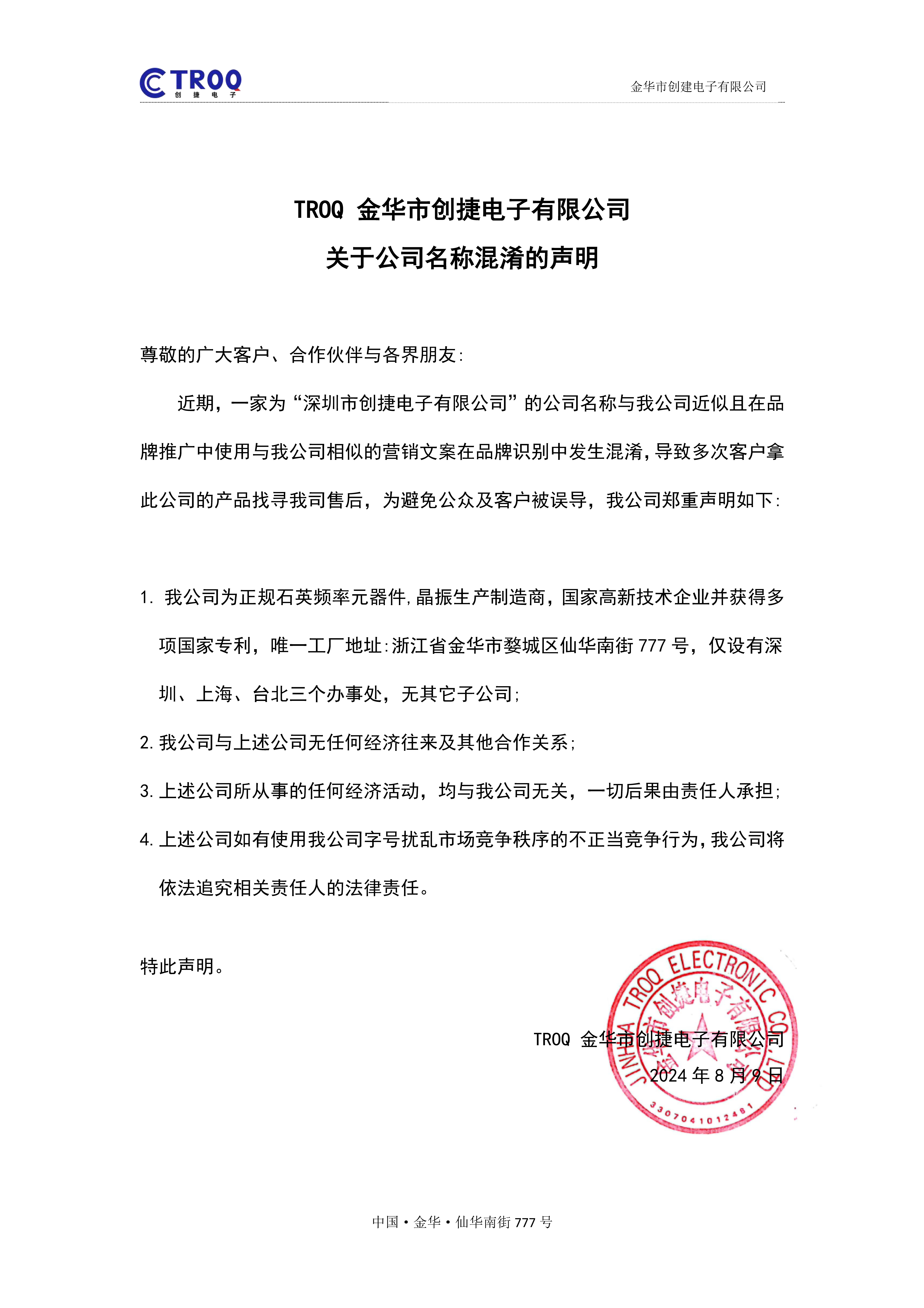 TROQ 金華市創(chuàng)捷電子有限公司關(guān)于公司名稱混淆的聲明