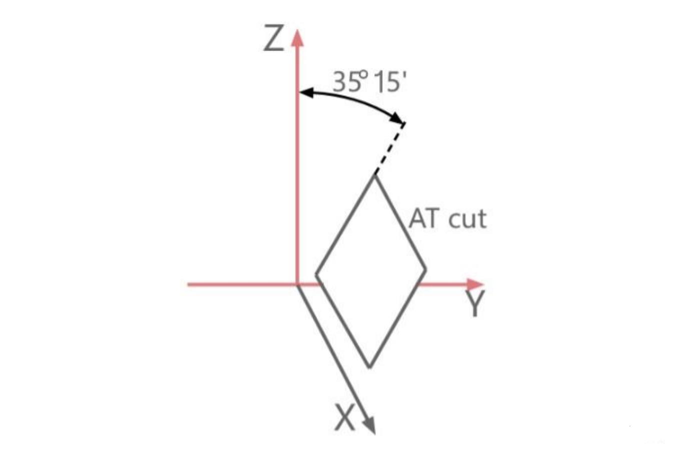 AT切割是最常見和廣泛使用的水晶切割之一。它于1934年開發(fā),并在石英晶體中使用。AT切割的特點是將晶體的X軸與Z(光)軸傾斜35°15'的方式進行切割。它具有厚度剪切振動模式,并在頻率-溫度曲線上呈現(xiàn)正弦曲線。頻率常數(shù)為1.661 MHz·mm。